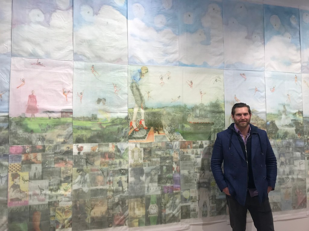 The resulting piece spans 15 by 40 feet, with three long horizontal rows of sheets pinned together. He calls it Apokaluptein:16389067 and has shown a scaled-down replica of it in a handful of galleries since his release. It’s currently at Julio Fine Arts Gallery at Loyola University Maryland through February 28. Though he includes other work in the Baltimore show, the title piece is perhaps his most impressive, spanning the length of one wall of the gallery and busier and more colorful than the other work.